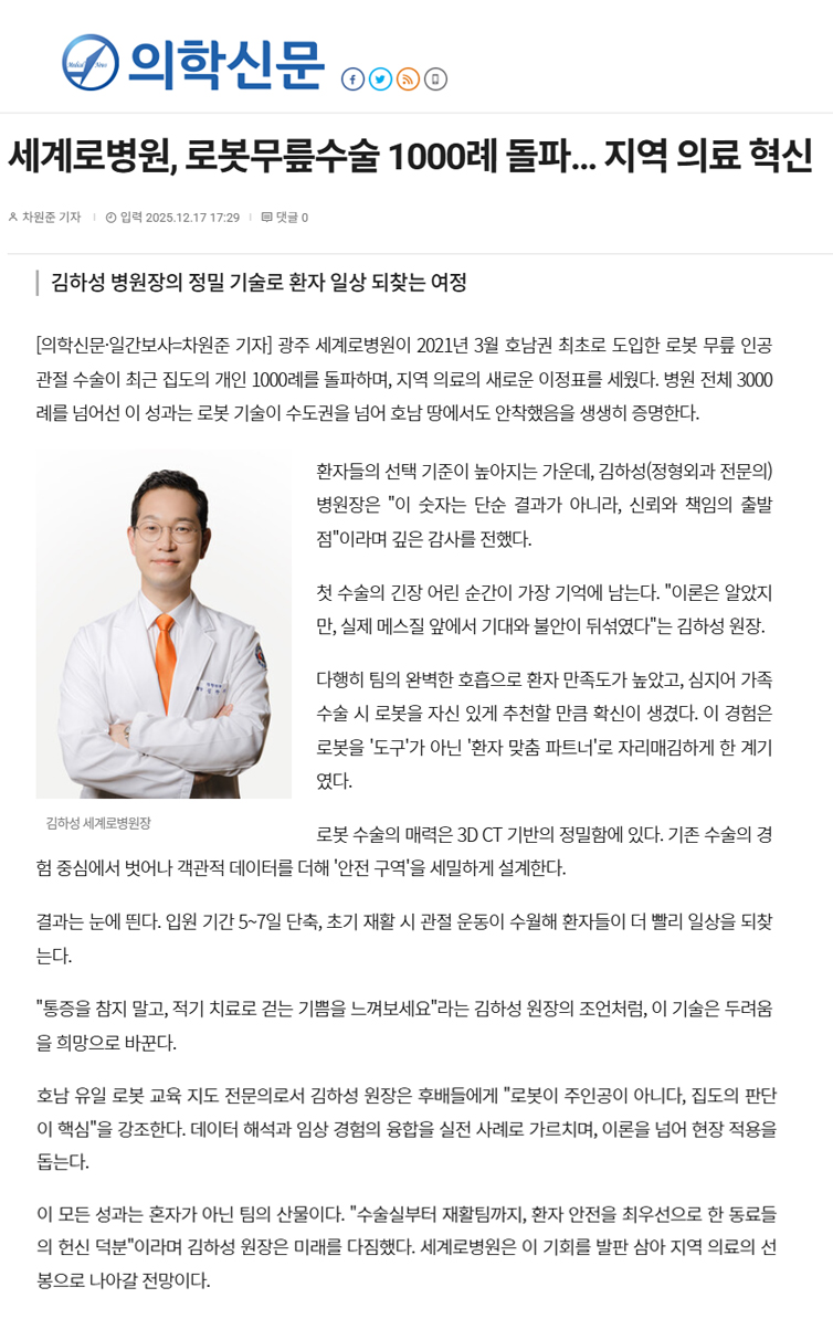 [의학신문] 세계로병원 김하성 원장, 로봇무릎수술 1000례 돌파… 지역 의료 혁신