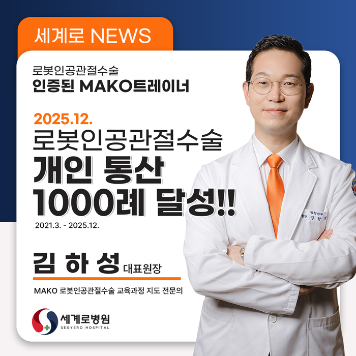 - 다음글[더센뉴스] 로봇 무릎 인공관절 수술 1000례…세계로병원 성과 주목 김하성 원장 25.12.23
