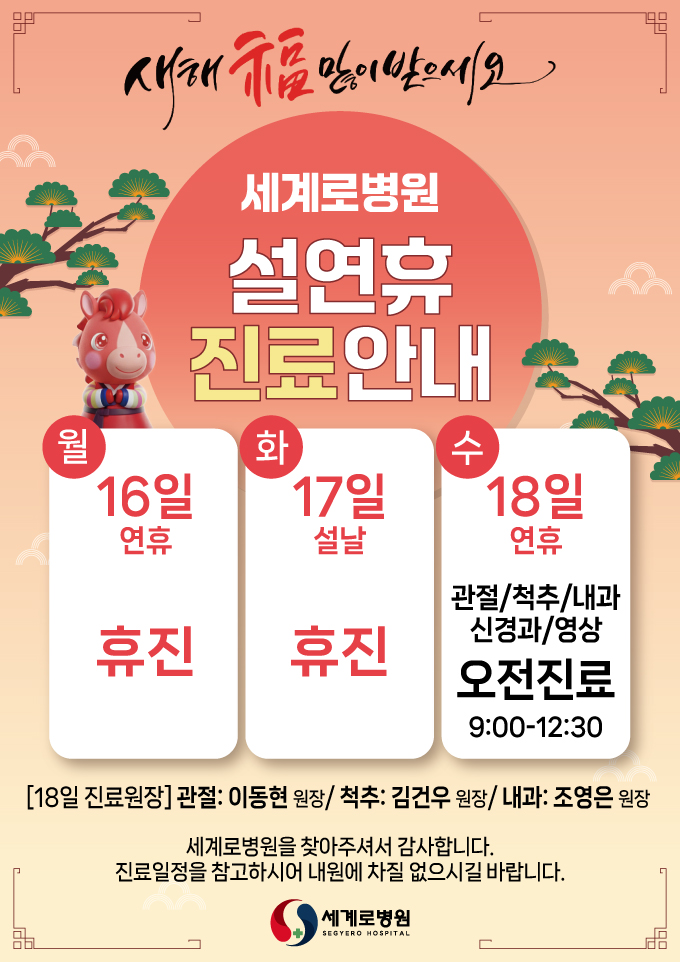 2월 18일(수) 설연휴 관절/척추/내과/신경과 오전 진료 9:00-12:30